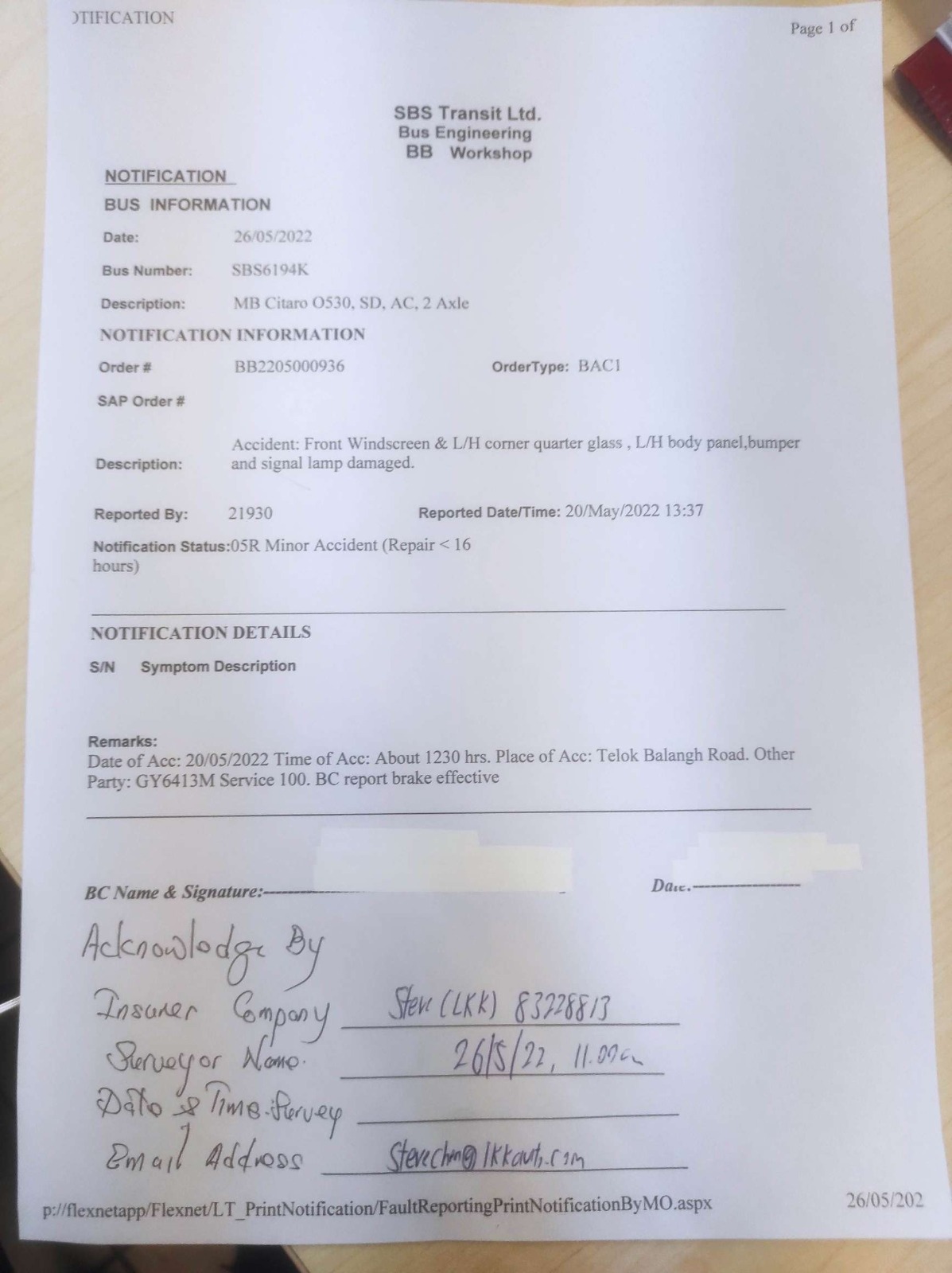 5/26/2022 11:30 AM 152064 RE_ SNM22D203577_C02_GY6413M_LEWLC _ RE_ Pre_repair inspection notice _ Accident involving SBS Transit SBS6194K and GY6413M on 2.msg